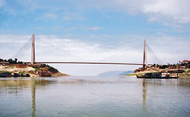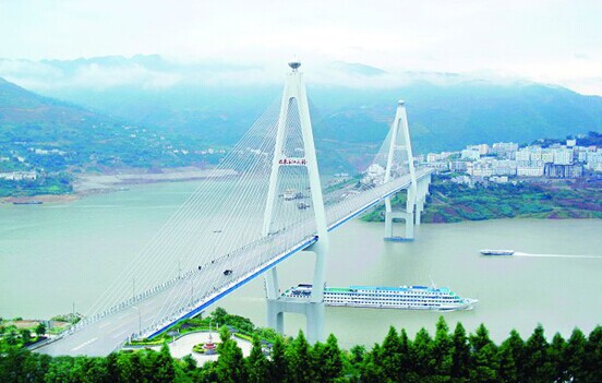 巴東長江公路大橋:建設總長2100米,橋長900.5米,主跨388米,為五跨連續(xù)雙塔雙索面預應力砼斜拉橋。橋面寬19米(不含錨索區(qū)),設四車道及兩側(cè)各1.5米寬的人行道,北主塔高212米,時居同類型橋...