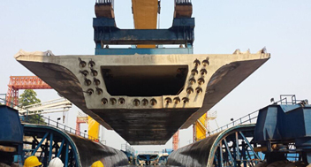 5月13日下午16時(shí),伴隨著機(jī)器的轟鳴聲、鞭炮聲、熱烈的掌聲和歡呼聲,900T輪式提梁機(jī)將737.6噸箱梁緩緩提起,成