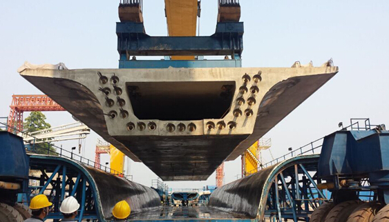 900T輪式提梁機是吊運箱梁的主要起重設備,自重550噸,額定運載能力900噸,凈跨寬度38米,起吊高度12.5米,主要用于24米至32米箱梁的脫模移梁施工。該提梁機的主體結構由行走系統(tǒng)、起升系統(tǒng)、動力系統(tǒng)、液壓系統(tǒng)、電控系統(tǒng)、制動系統(tǒng)、操作系統(tǒng)等主要結構組成。其外部主體結構還包括端主梁與橫梁,主梁另有單主梁與雙梁形式;4條支腿、64個車輪。該機主結構為門架結構,采用“人”字型支腿,可進行大幅度起升、高度調整和90°轉向跨區(qū)作業(yè),結構先進、合理,操作可靠、安全,作業(yè)靈活。