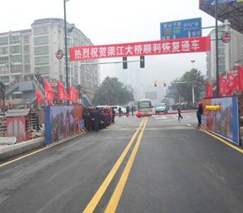 2014年12月29日上午10時30分,舉行了G318線渠縣渠江大橋恢復(fù)通車的儀式。渠縣縣委書記王善平、縣長茍小莉、 橋梁公司董事長蔡樂軍出席??h委、縣政府相關(guān)單位負責人,特種工程分公司總經(jīng)理吳春其、黨支部書記魏文生陪同參加。