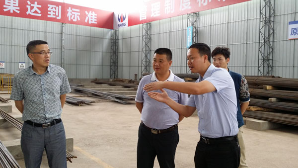 圖為公司黨委書(shū)記蔣德光(左二)認(rèn)真聽(tīng)取支部委員、項(xiàng)目經(jīng)理張捷介紹標(biāo)準(zhǔn)化鋼筋加工場(chǎng)建設(shè)情況。