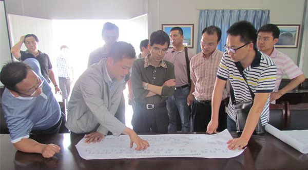 謝副市長(前中)聽取在四川路橋成貴鐵路項(xiàng)目經(jīng)理部黨工委書記夏勇(前左二)匯報(bào)我部征拆推進(jìn)情況。
